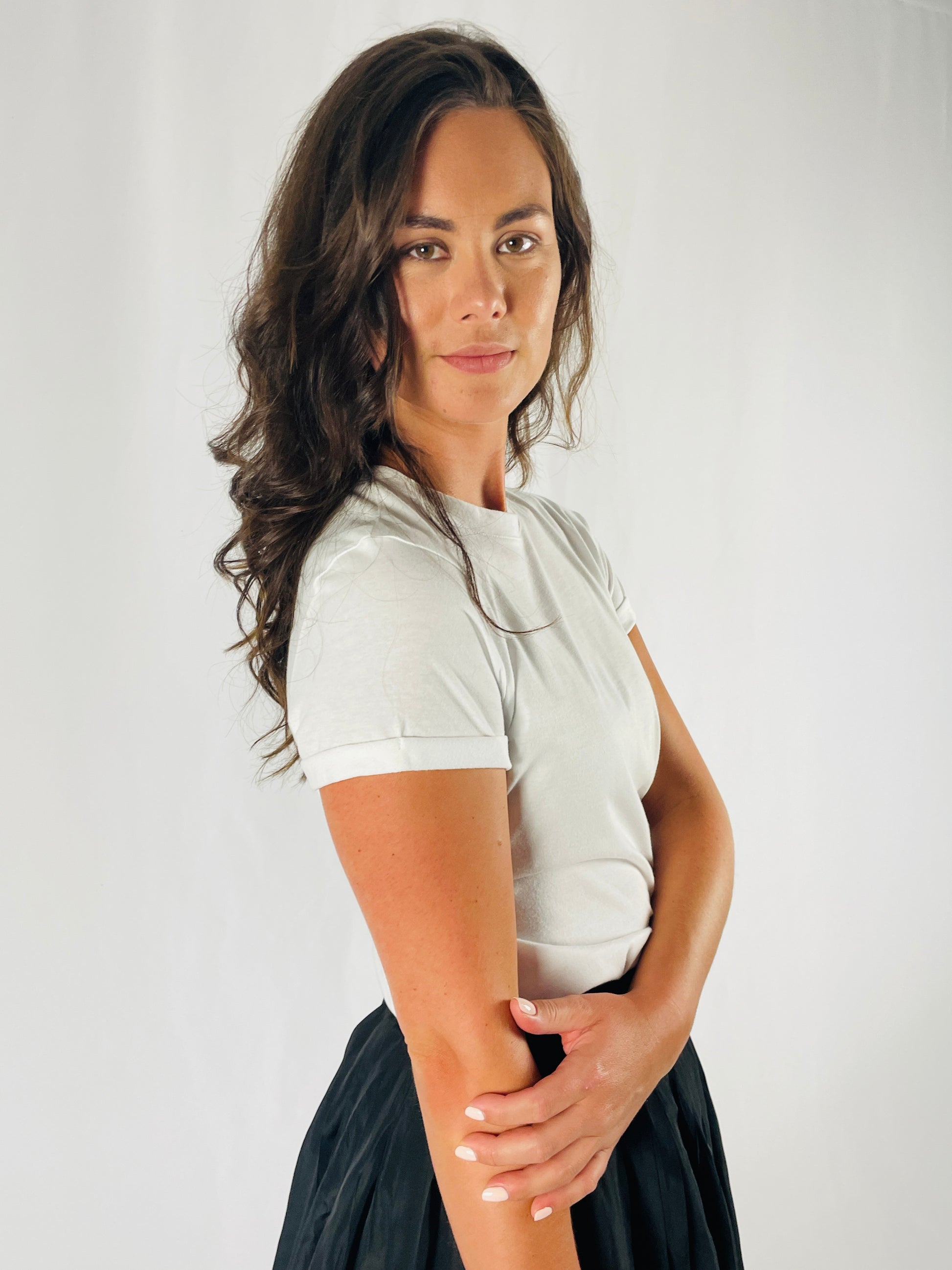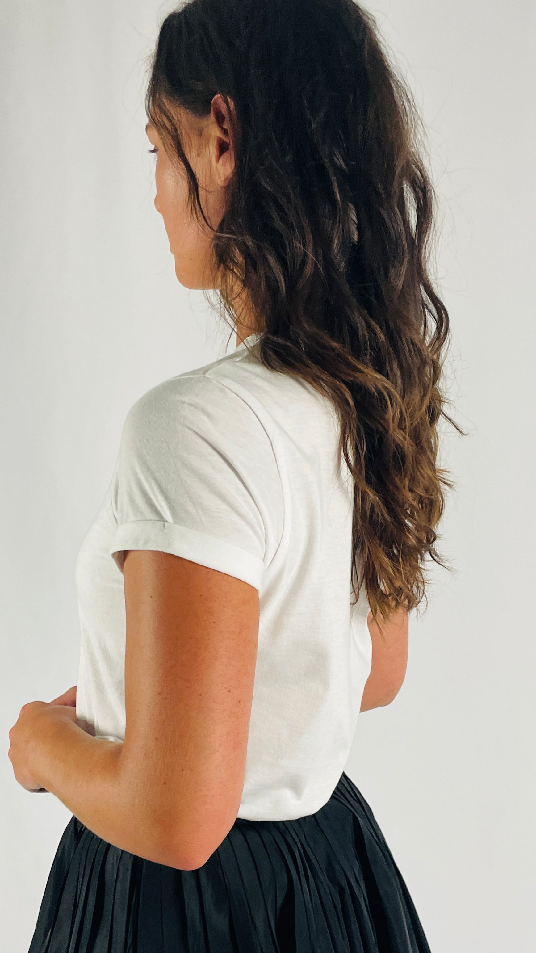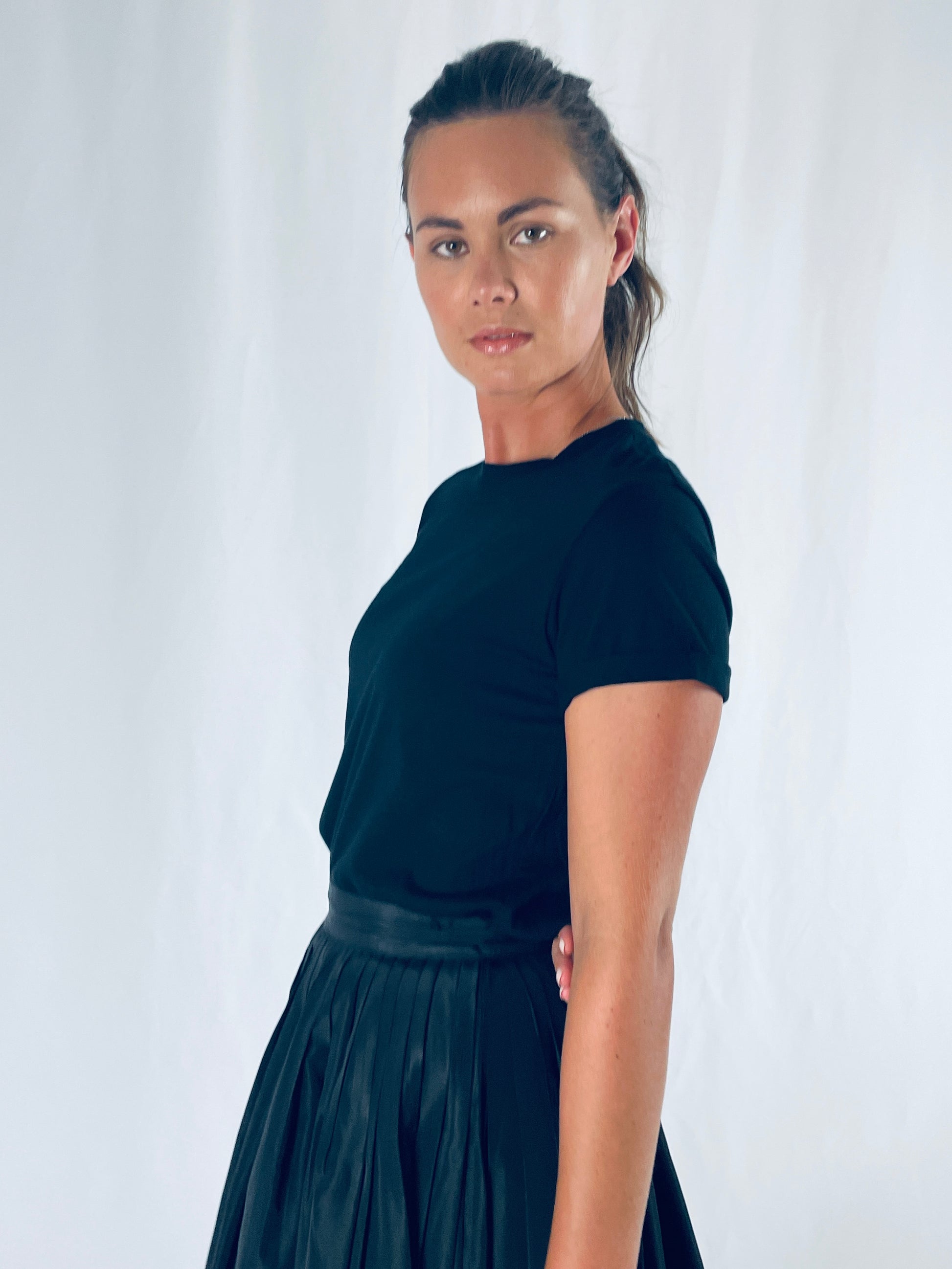 The Rueneau Crewneck Tee is the same great quality as our V Neck Tee. Made with 100% Japanese cotton, styled with the perfect high neckline and a double folded cap sleeve for balance. A flattering fit across the bust, cut long to offer options, wear over bottoms or tuck in for a perfect polished crewneck tee. Size up for an oversized blousy look. Available in white, black and red.