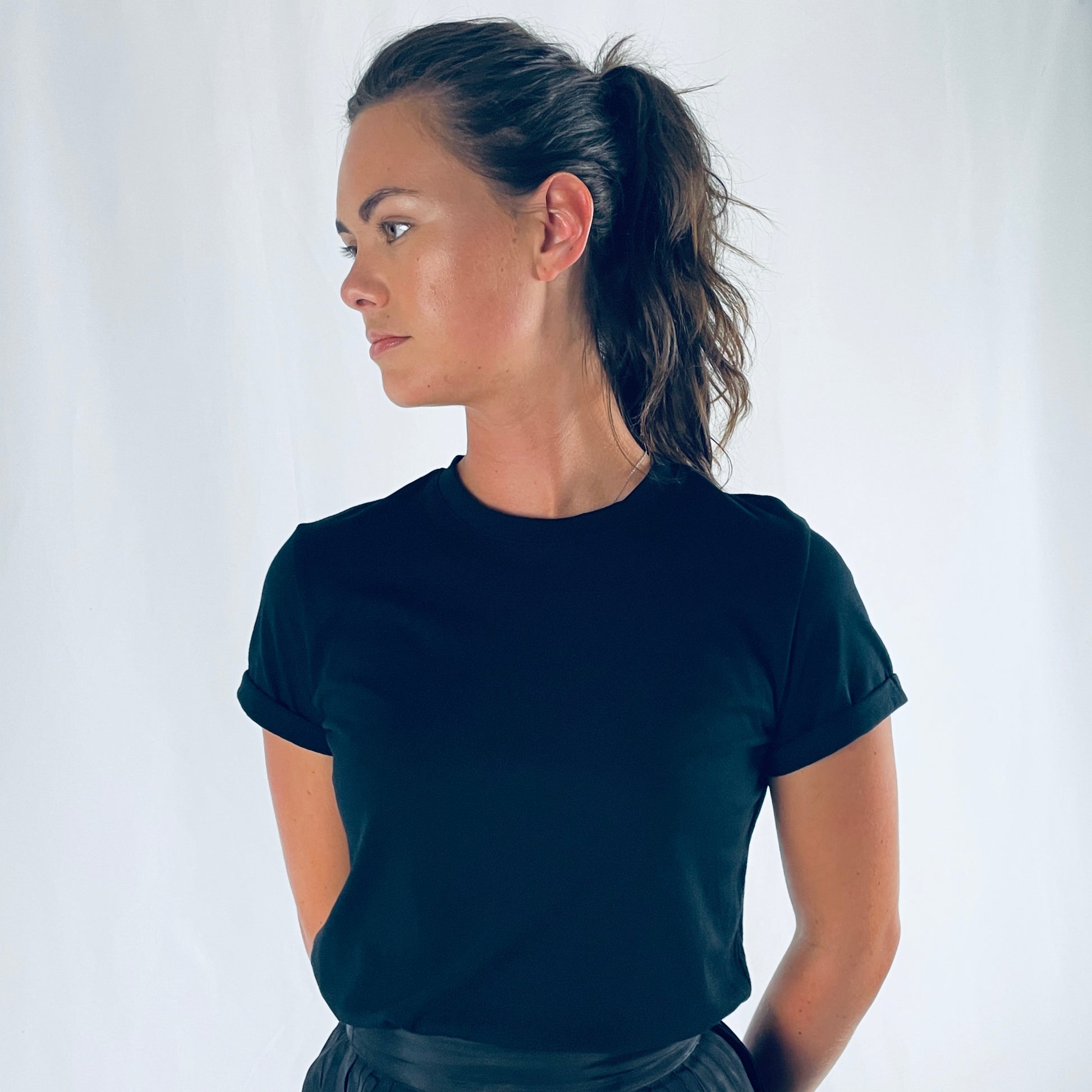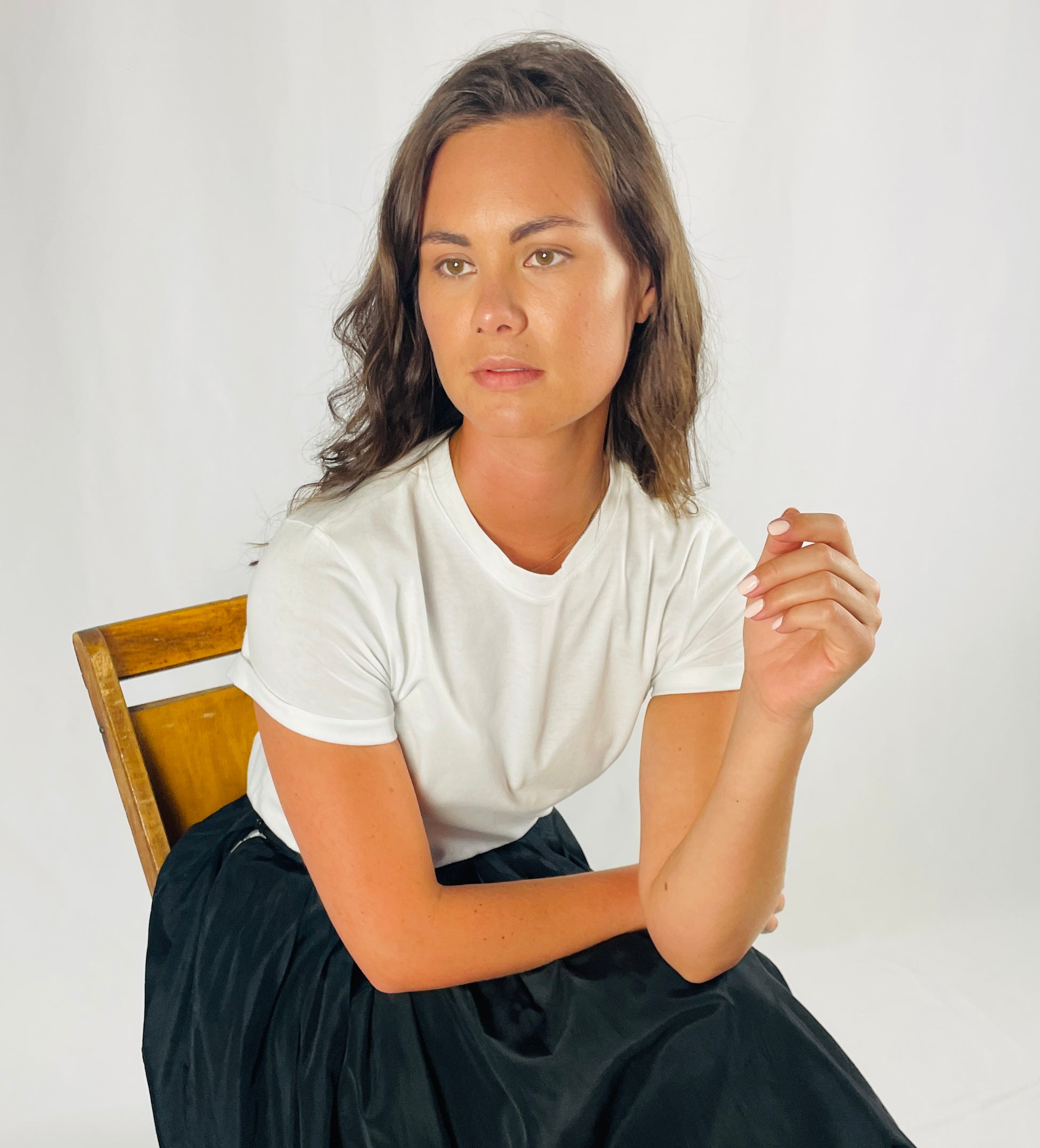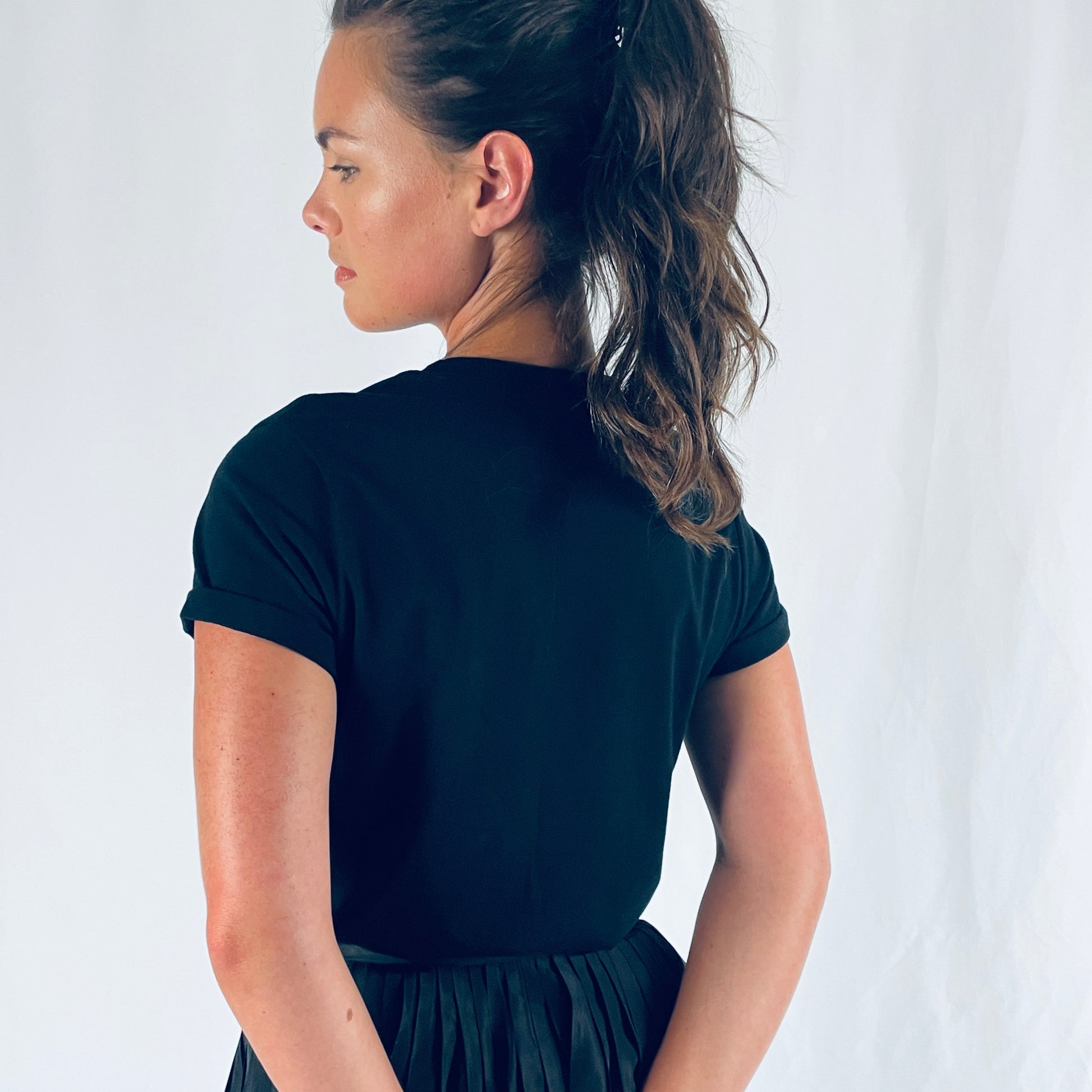 The Rueneau Crewneck Tee is the same great quality as our V Neck Tee. Made with 100% Japanese cotton, styled with the perfect high neckline and a double folded cap sleeve for balance. A flattering fit across the bust, cut long to offer options, wear over bottoms or tuck in for a perfect polished crewneck tee. Size up for an oversized blousy look. Available in white, black and red.