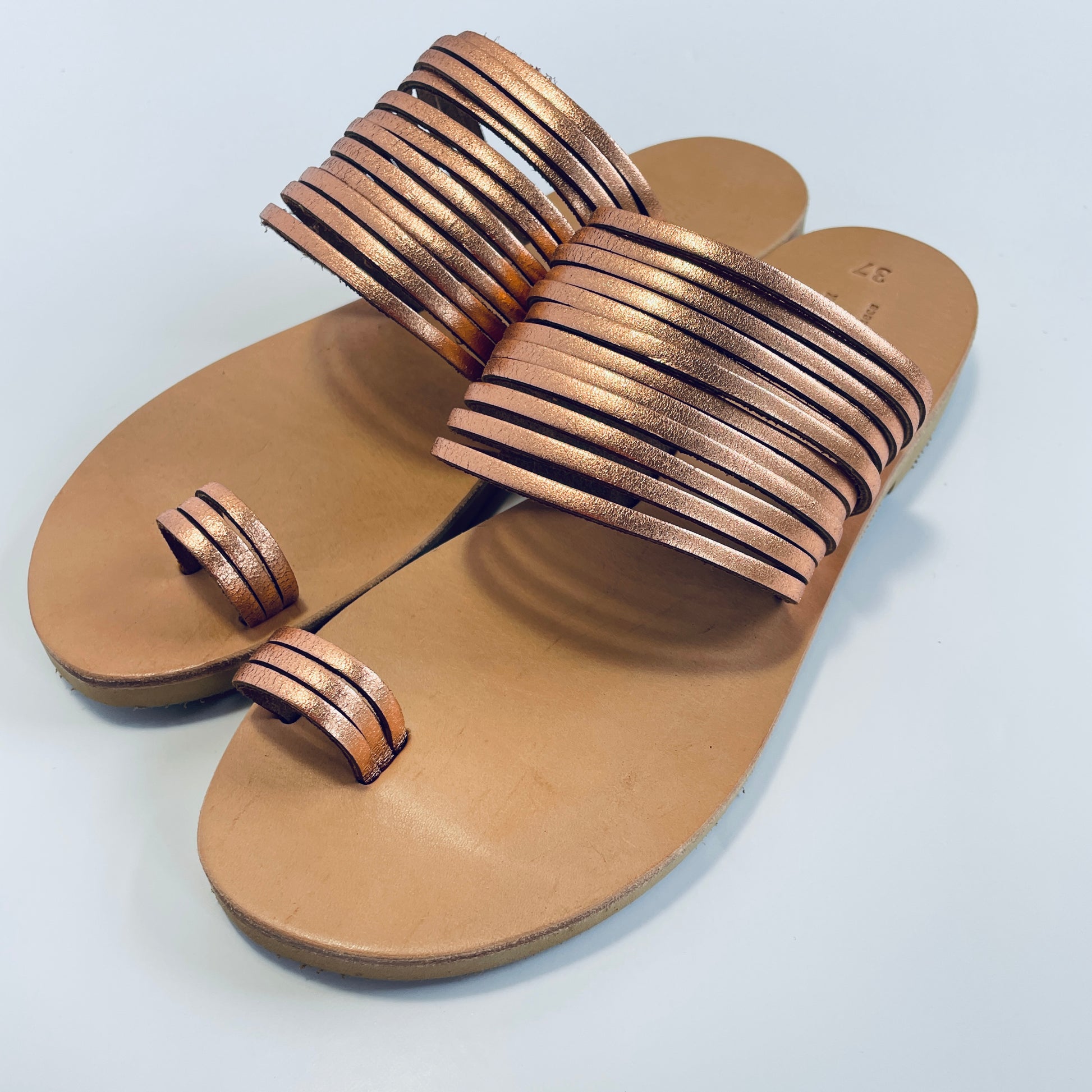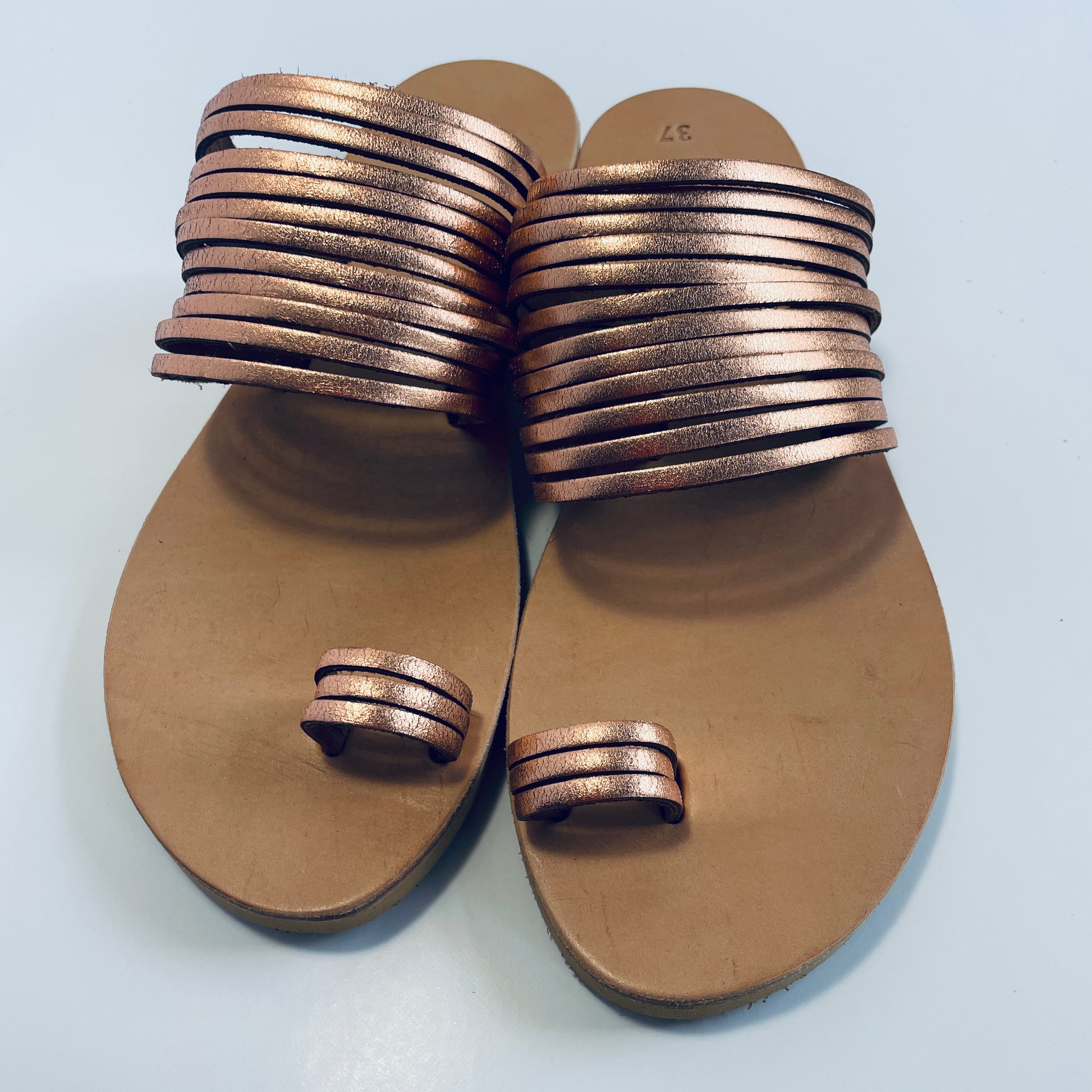 Handmade leather sandals from Greece. Beautiful lamé leather in pale gold or rose gold. Casual and elevated at the same time. Wear with denim, skirts, dresses and trousers. Fits a half size large.